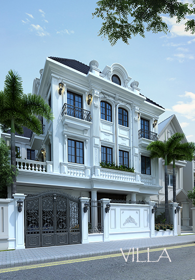 Thiết kế ngoại thất của ngôi nhà với tông màu trắng chủ đạo nhẹ nhàng nhưng kết hợp cùng các chi tiết trang trí kiến túc tỉ mỉ giúp ngôi nhà mang một nét sang trọng và kiêu sa. Căn biệt thự được thiết kế ở một khoảng không gian rộng rãi giúp ngôi nhà thật sự nổi bật so với các không gian kiến trúc xung quanh. Các kiến trúc sư đã khéo léo kết hợp các đường nét kiến trúc cổ điển như sử dụng gờ, phào chỉ cùng với các khối kiến trúc hiện đại tạo nên sự lôi cuốn cho kiến trúc của ngôi nhà này.