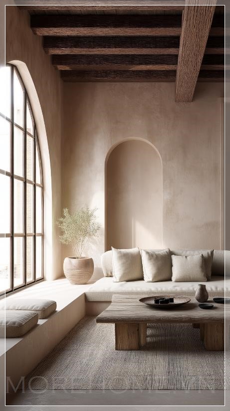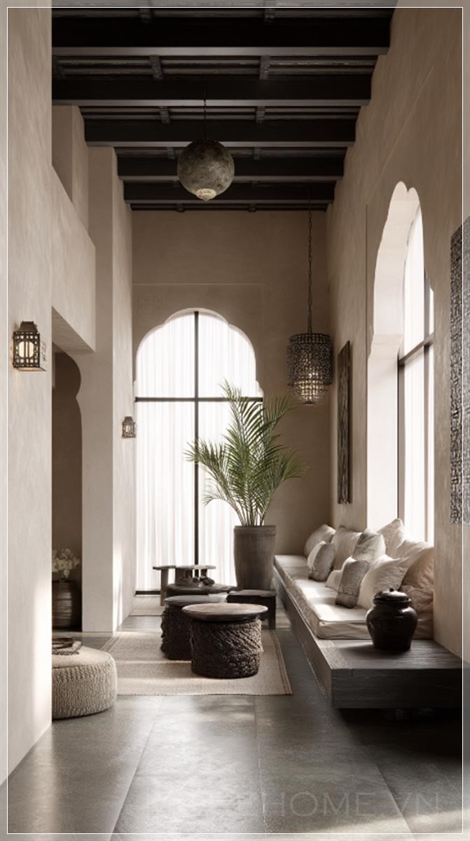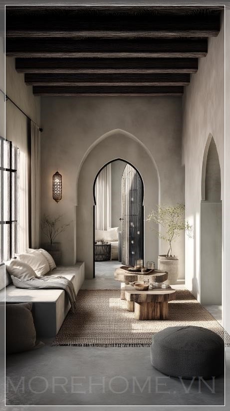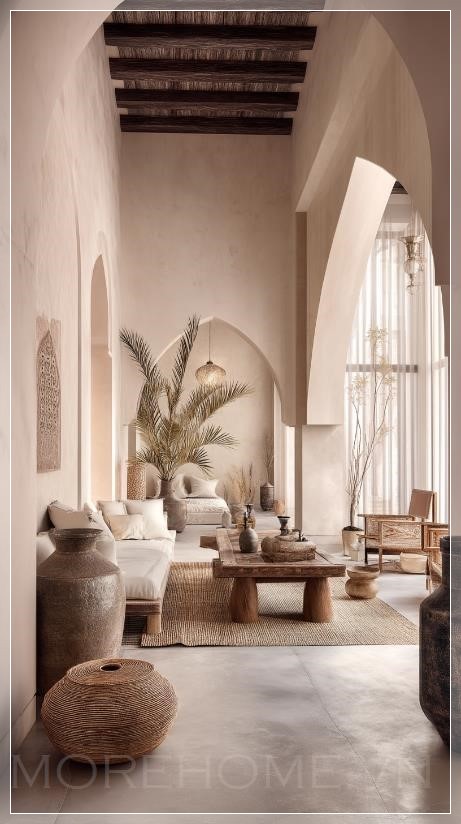 Ảnh siêu thực tế, góc nhìn từ trong, phòng khách riad Morocco ấm cúng, phong cách kiến trúc tối giản và truyền thống, không gian ấm áp, ánh sáng huyền bí và không gian, phong cách kiến trúc Ả Rập, kiến trúc thuần khiết, các yếu tố tối giản, bảng màu trung tính, vật liệu tự nhiên truyền thống.