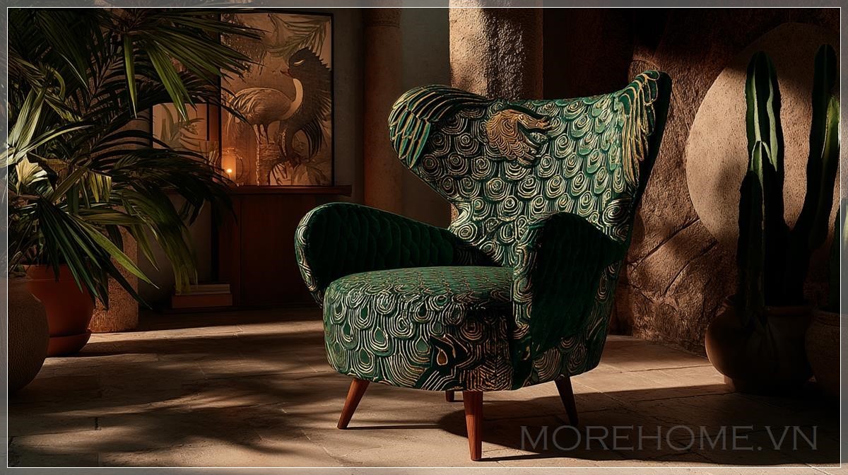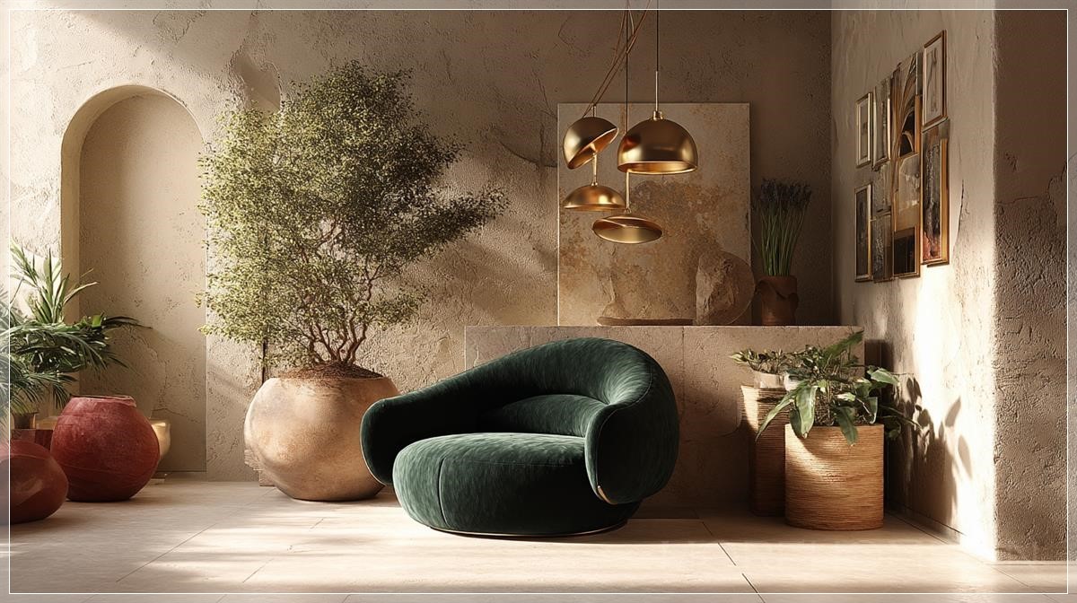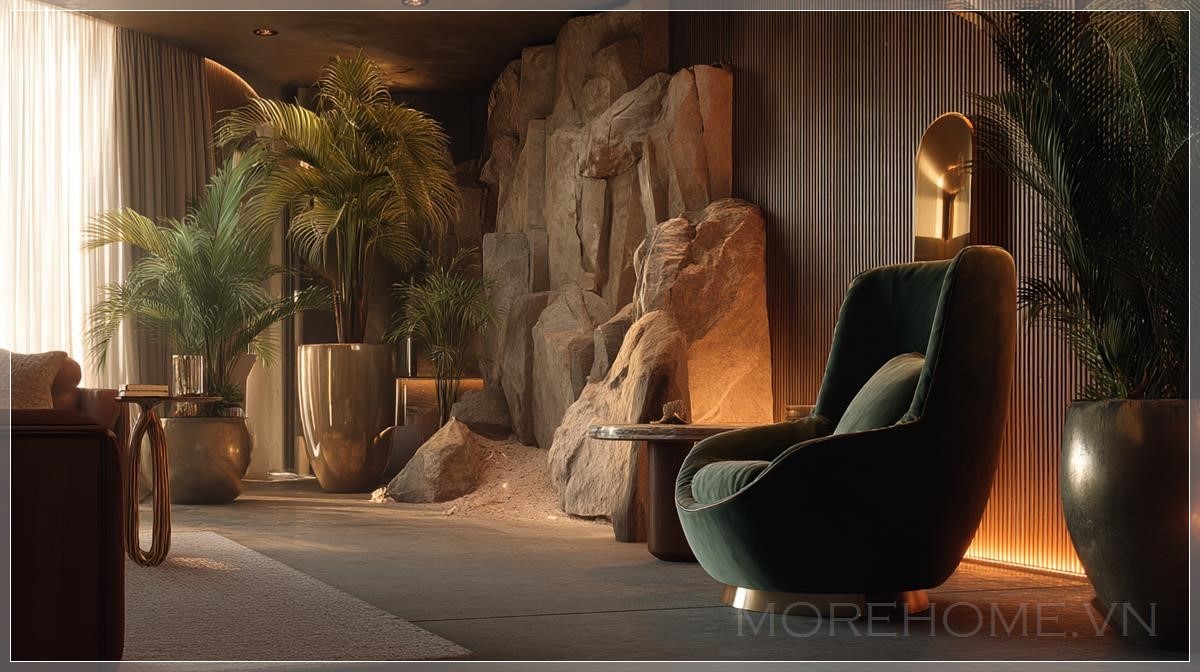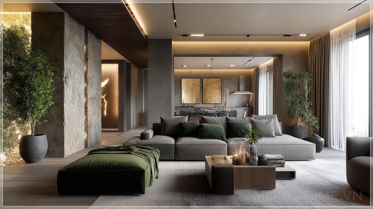Phòng khách hiện đại sang trọng và đầy khí chất, thiết kế cho gia đình, kết hợp ảnh hưởng biểu tượng và nghệ thuật từ Gustav Klimt và Aubrey Beardsley, với các yếu tố huyền bí lấy cảm hứng từ con griffin ngự trên các vách đá cát, xung quanh là cành cây khô. Bảng màu ấm của đá và vàng đất, đồ nội thất bằng gỗ tự nhiên, vải nhung màu xanh đậm và đồng. Ghế tựa điêu khắc với hình dạng lấy cảm hứng từ griffin, tranh tường trừu tượng màu vàng và đen, tường tranh với ảnh du lịch và tranh nghệ thuật. Góc ấm cúng với cây cảnh lớn trong các chậu gốm có kết cấu. Ánh sáng nghệ thuật với bóng mờ ấm, phong cách hiện đại đầy cảm hứng.