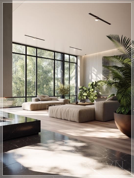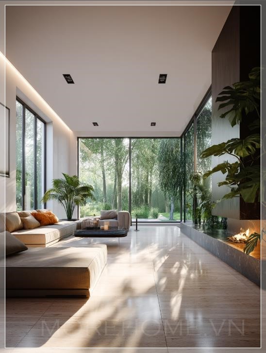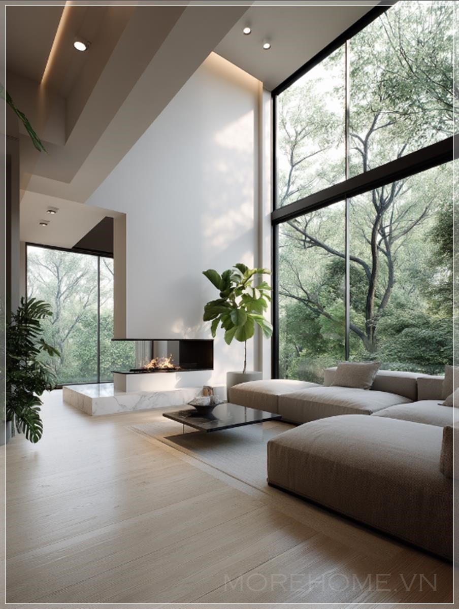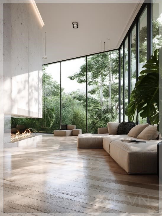 Nội thất phòng khách hiện đại tối giản, không gian mở rộng với cửa sổ từ sàn đến trần chiếm 40% khung cửa, tán lá dày đặc của các loại cây kết hợp (maple và cypress) nhìn thấy qua kính với chiều sâu cảnh vật, bảng màu tông trung tính với sàn gỗ sồi ấm và tường trắng mờ, đồ nội thất tối giản với hình dạng hình học rõ ràng, hệ thống chiếu sáng âm trần tạo ra ánh sáng dịu dàng, lò sưởi treo hiện đại làm điểm nhấn, cây monstera trong chậu trang trí gần cửa sổ, ánh sáng mặt trời lọt qua lá cây tạo ra các mẫu bóng tự nhiên trên sàn đá marble bóng loáng, render chất lượng photorealistic 8k với hình ảnh kiến trúc, ống kính góc rộng nhấn mạnh sự lưu thông không gian, chi tiết kết cấu tinh tế trong vải bọc vải lanh và các chi tiết kim loại chải, thiết kế sinh học tích hợp với cây xanh ngoài trời.
