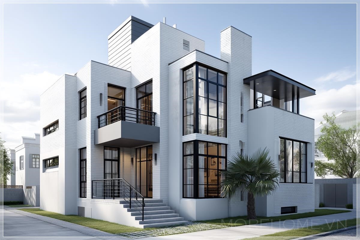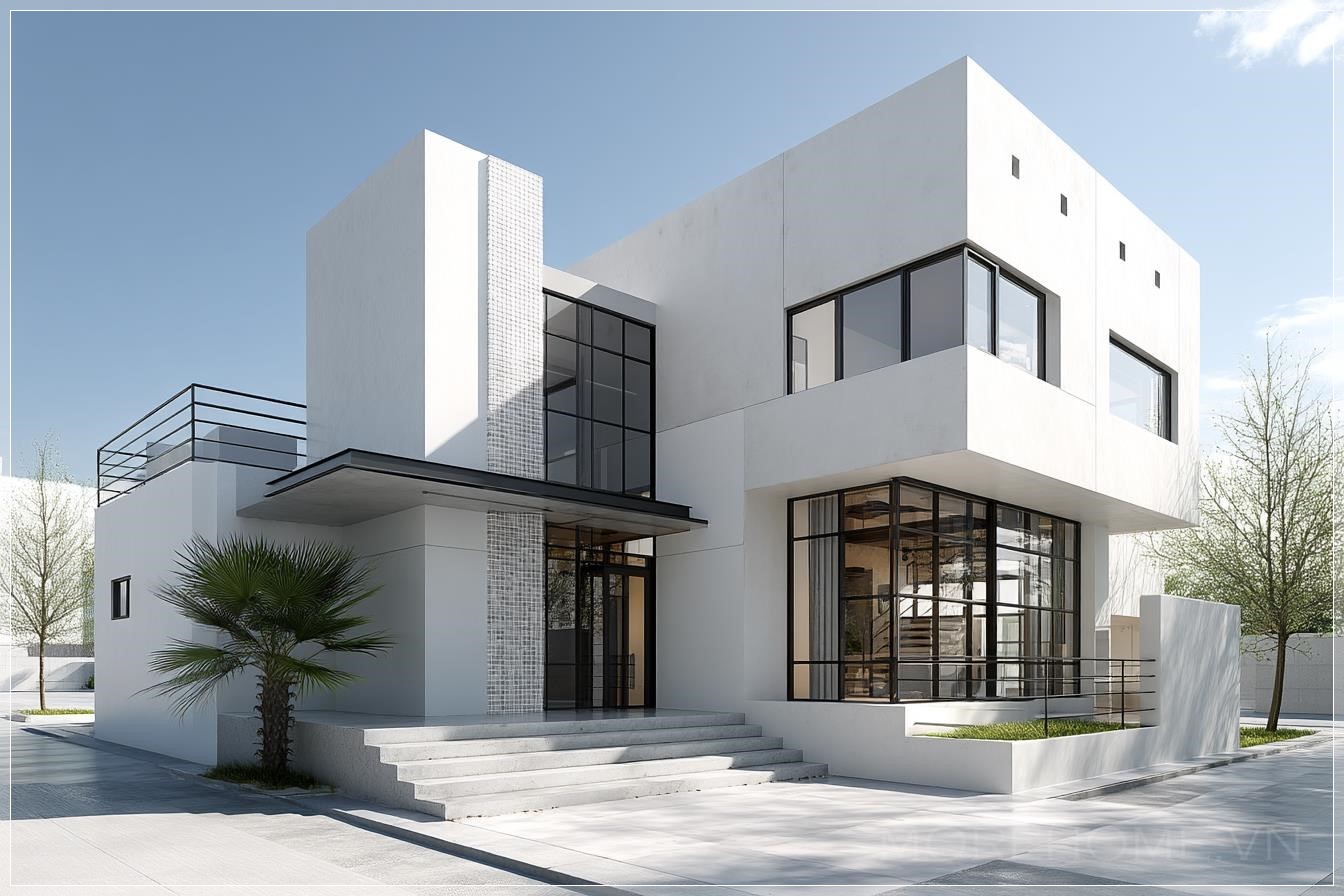 Một tòa nhà hiện đại, tối giản hai tầng với tường vữa trắng và cửa sổ đen, mái ngói màu xám, cầu thang ở phía bên phải của mặt tiền, mái phẳng, một cây cọ nhỏ ở góc sân và cỏ xanh mượt. Đây là một bản render 3D, ví dụ về nhiếp ảnh và thiết kế kiến trúc, với bối cảnh là bầu trời xanh và phong cách siêu thực, điện ảnh.