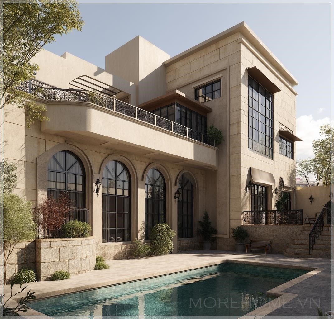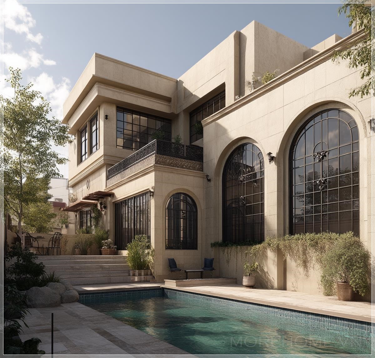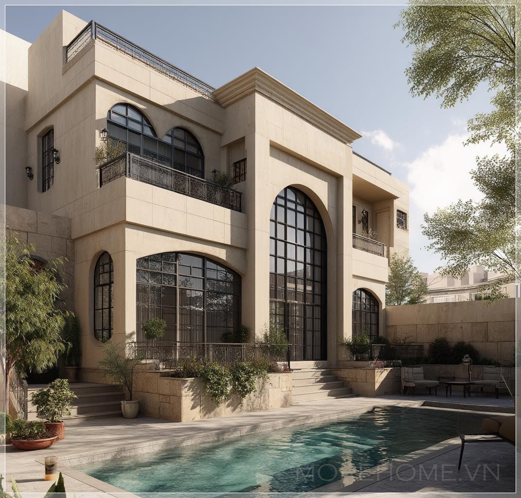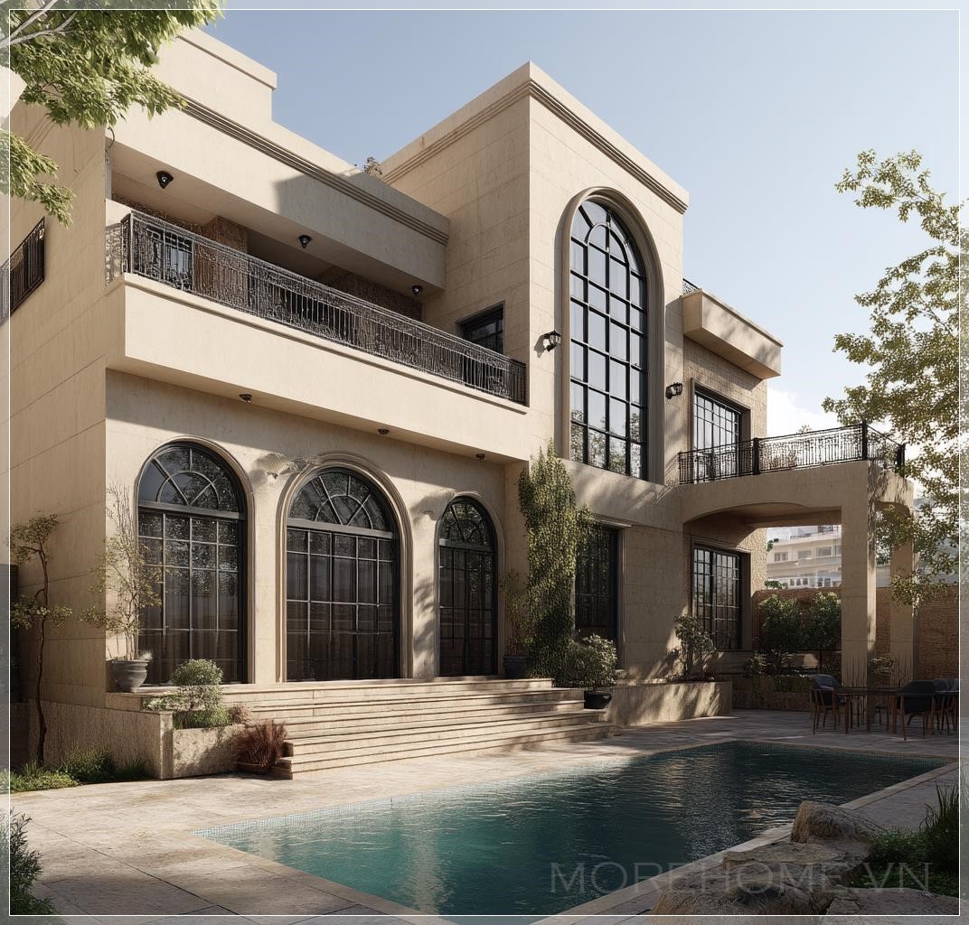 Biệt thự theo phong cách Ba Tư, màu be với cửa sổ đen và cửa vòm, nhìn từ mặt tiền, hồ bơi bên ngoài ngôi nhà, khu vườn gần hồ bơi, tường màu nâu nhạt, sân thượng trên mái nhìn ra thiên nhiên, phong cách render chân thực, màu sắc ấm áp, thực tế kiến trúc, sử dụng nhiếp ảnh độ phân giải cao.