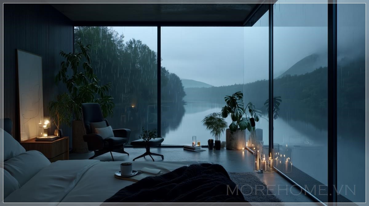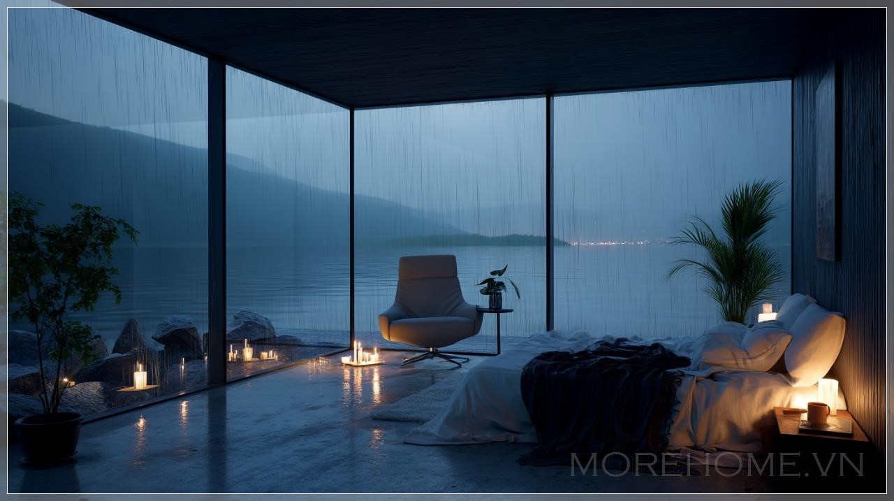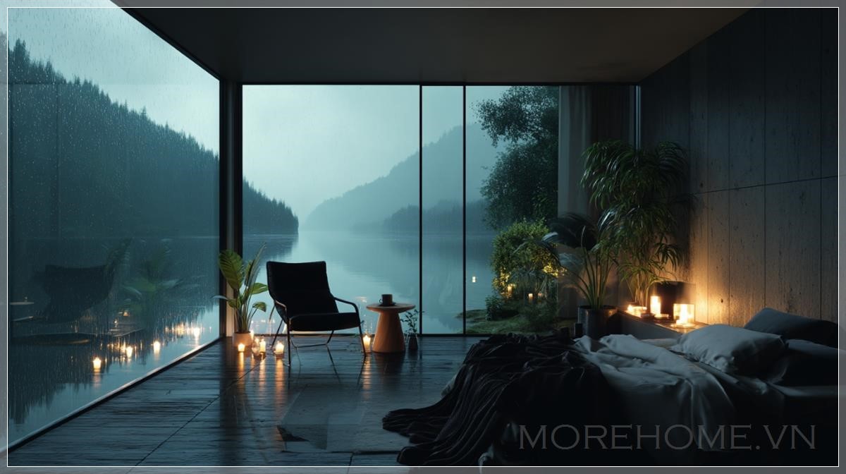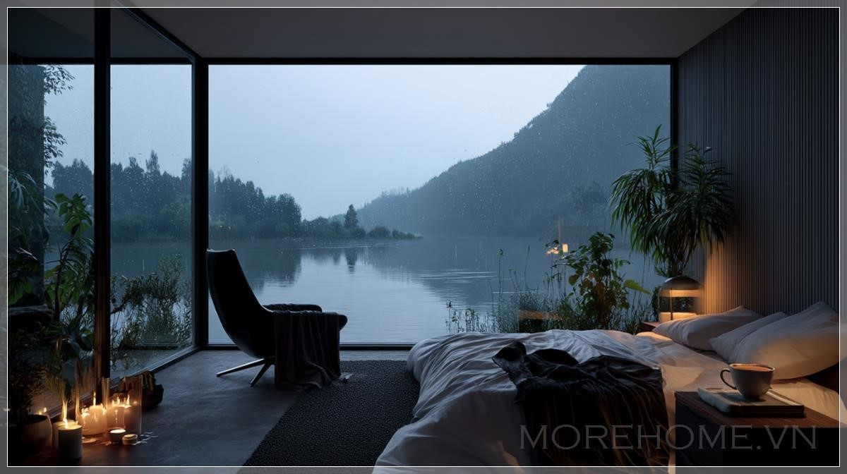 Phòng ngủ hiện đại tối giản với cửa kính từ sàn đến trần, nhìn ra hồ yên tĩnh và những ngọn đồi rừng mờ ảo vào ban đêm. Bên ngoài, cảnh vật tối mờ với những giọt mưa nhẹ rơi trên mặt hồ, phản chiếu ánh trăng mờ và những dãy núi xa xăm. Bên trong, ánh sáng mềm mại, ấm áp từ đèn bàn đầu giường và vài ngọn nến đang nhấp nháy tạo ra không khí yên tĩnh. Một chiếc ghế bành thanh mảnh đặt cạnh cửa sổ, trên bàn đầu giường bằng gỗ là một cốc gốm đang tỏa hơi nước nhẹ. Chiếc giường được phủ chăn ga màu trắng mịn và một chiếc chăn tối màu vắt nhẹ nhàng. Những cây trồng nhiệt đới bên cửa sổ làm mềm đi những đường nét của không gian hiện đại. Không gian toát lên sự tĩnh lặng, bình yên và cực kỳ thư giãn, chất lượng ảnh siêu thực, thời gian ban đêm, mưa ngoài trời, siêu thực, phong cách điện ảnh.