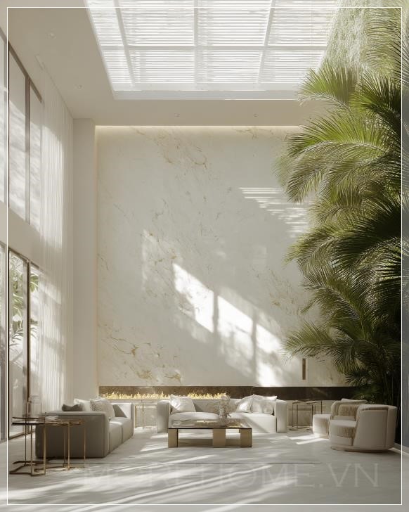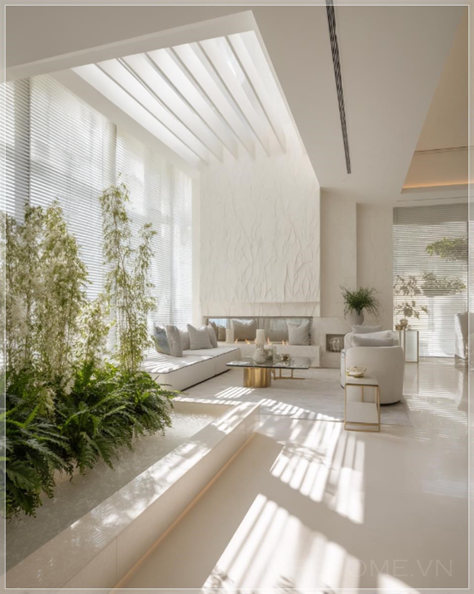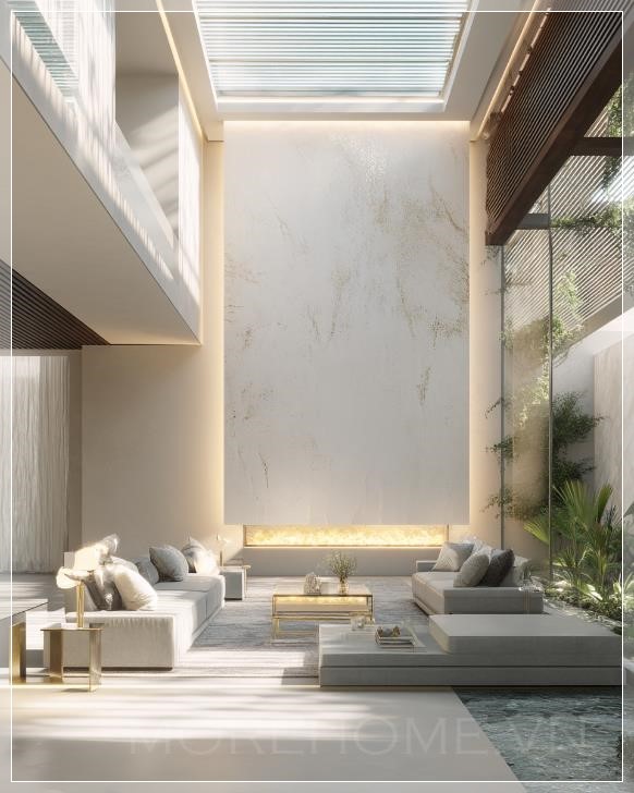 Phòng khách chính rộng lớn trong một biệt thự sang trọng ở Dubai, được chiếu sáng qua cửa sổ mái vòm khổng lồ với khung chớp, nhìn qua những cây xanh tươi tốt. Trên bức tường là một tác phẩm nghệ thuật nổi bật, hoàn thiện với lớp thạch cao Venetian trắng tinh khiết và những vệt vàng ánh lên tạo nên một phông nền lung linh, gần như huyền ảo, với một lò sưởi avant-garde tích hợp. Không gian này bao gồm một bộ sofa thấp, tinh tế với màu xám nhạt và ngà, được trang trí với nhiều gối có màu sắc tương phản, cùng với một đài phun nước nhỏ tích hợp tinh tế, điểm nhấn bằng các chi tiết kim loại vàng nhẹ trên bàn cà phê kính và tủ bên. Sàn bê tông bóng loáng và trần nhà lùi vào với hệ thống chiếu sáng tuyến tính tích hợp tạo ra sự tương tác hài hòa giữa bóng tối và ánh sáng. Cửa sổ từ sàn đến trần mang ánh sáng tự nhiên tràn vào, tạo ra những họa tiết bóng và ánh sáng tuyệt đẹp trên không gian. Cảnh hoàng hôn đẹp, với những đám mây tuyệt vời, bảng màu ấm áp bị giảm bão hòa mạnh, nhấn mạnh vào việc tạo khung và sự cân đối trong bố cục, với nền ngày càng mờ dần, tạo nên một cảnh tượng huyền bí, chi tiết và đầy không khí.