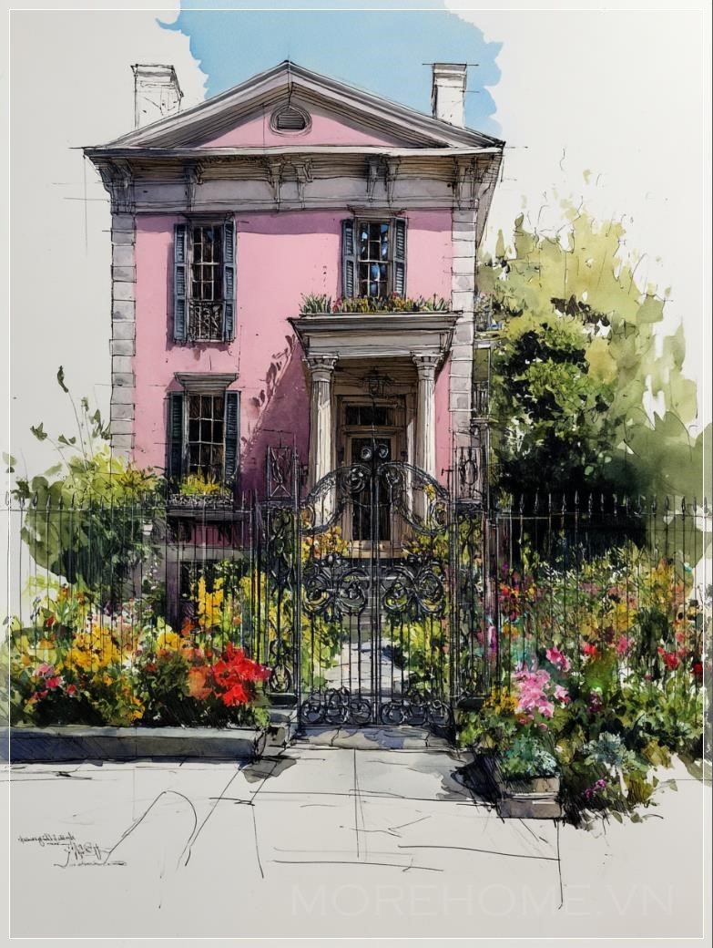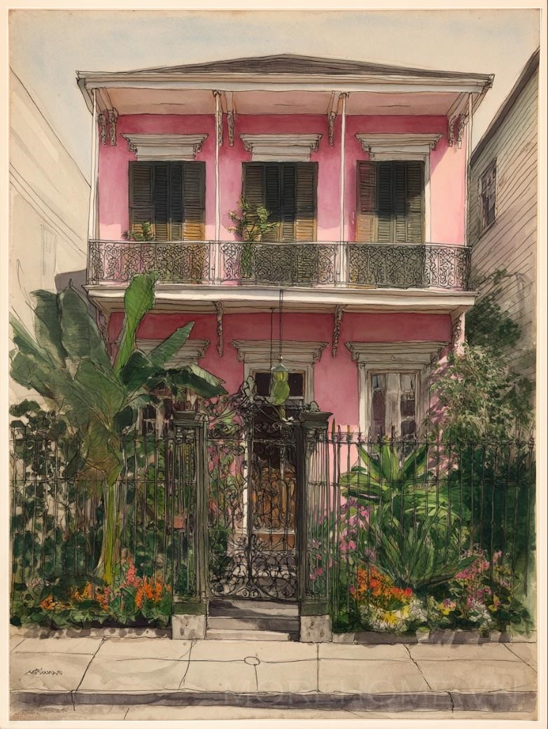 Từ góc nhìn của một kiến trúc sư, bản phác thảo này nắm bắt được tinh thần của New Orleans - nơi lịch sử, văn hóa và cái đẹp đan xen vào nhau trong từng viên gạch, từng thanh gỗ. Những nét vẽ chì mềm mại phác họa cấu trúc chính, trong khi kỹ thuật thủy mặc mang đến sự sống động cho màu sắc - tạo cảm giác như ánh nắng đang nhảy múa trên mặt tiền ngôi nhà.