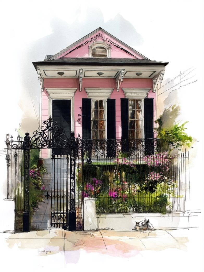 Trong trái tim nhộn nhịp của New Orleans, nơi âm nhạc jazz luôn vang vọng và không khí lễ hội tràn ngập khắp các con phố, tôi đã bắt gặp một viên ngọc kiến trúc đã khiến tôi đứng lặng: một ngôi nhà shotgun màu hồng pastel tinh tế, đứng kiêu hãnh sau hàng rào sắt rèn Pháp cổ điển đầy uy nghi.