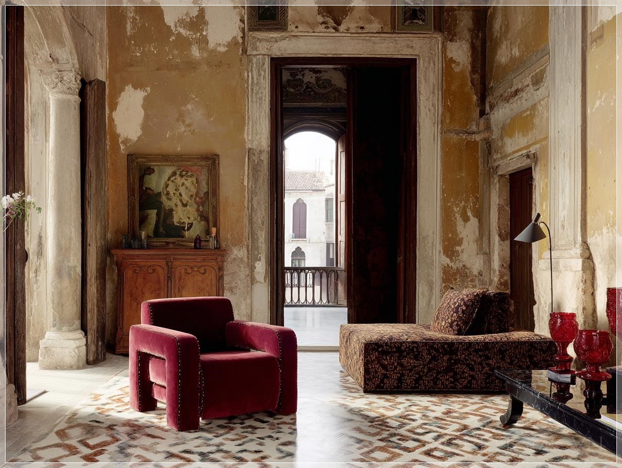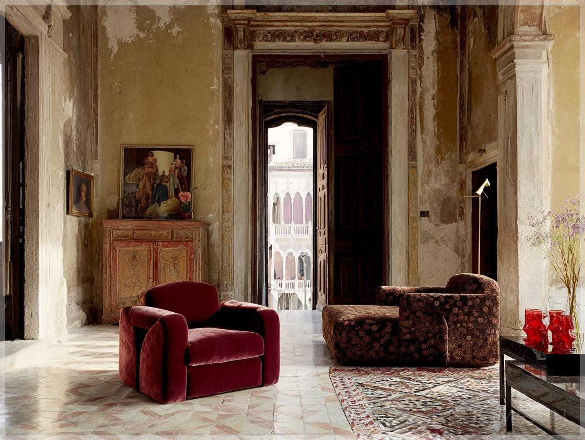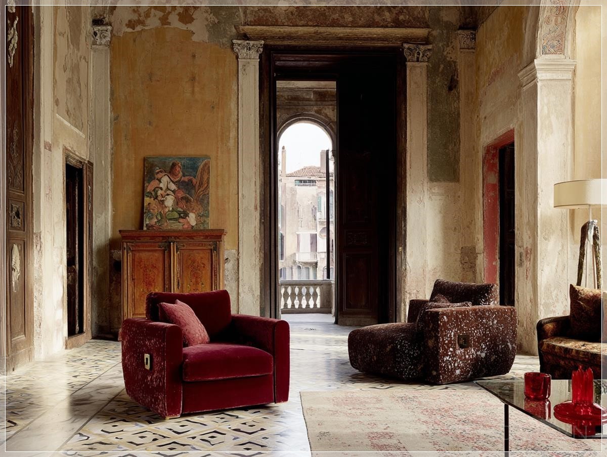Điểm nhấn đầu tiên thu hút ánh nhìn chính là cặp ghế bành đối xứng - một chiếc bọc nhung màu burgundy sâu thẳm và chiếc còn lại mang sắc nâu đậm trầm mặc, tất cả đều theo phong cách của nhà thiết kế huyền thoại người Ý, Gae Aulenti. Những đường nét bo tròn cổ điển kết hợp với chất liệu nhung cao cấp tạo nên sự tương phản tinh tế giữa mềm mại và cứng cáp trong tổng thể căn phòng.