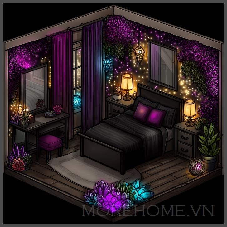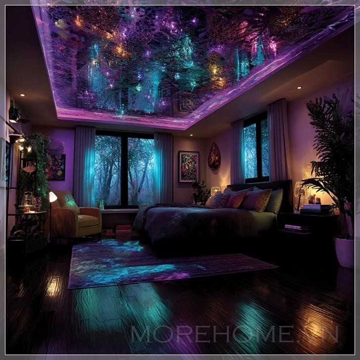 Ánh sáng là yếu tố quan trọng nhất trong việc tạo nên một không gian vũ trụ. Đèn LED dây với các tông màu xanh dương, tím và đen tạo nên hiệu ứng ánh sáng huyền bí, gợi nhớ đến những dải ngân hà xa xôi. Một chiếc máy chiếu sao nhỏ gọn có thể biến trần nhà thành bầu trời đầy sao lấp lánh, đưa bạn vào cuộc hành trình khám phá vũ trụ ngay khi nhắm mắt.