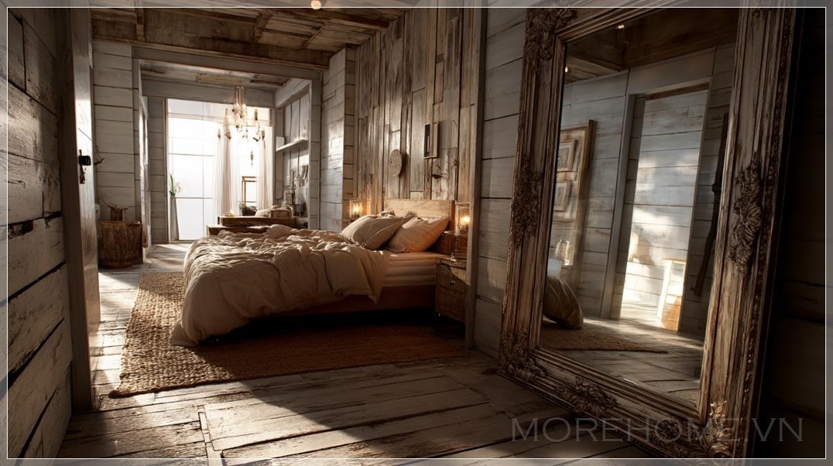 Xung quanh, những bức tường gỗ sơn trắng tạo nên một khung cảnh nhẹ nhàng, tinh tế. Lớp sơn trắng không phải là màu trắng sáng chói lòa, mà là một sắc trắng đục, như đã trải qua nhiều mùa nắng mưa, mang trong mình câu chuyện của thời gian. Qua bề mặt gương, những đường vân gỗ trở nên mơ hồ, hòa quyện vào nhau tạo nên một bức tranh trừu tượng của sự bình yên.