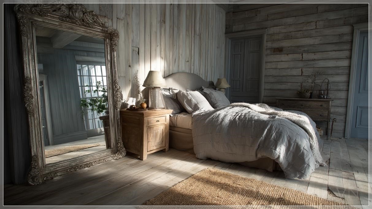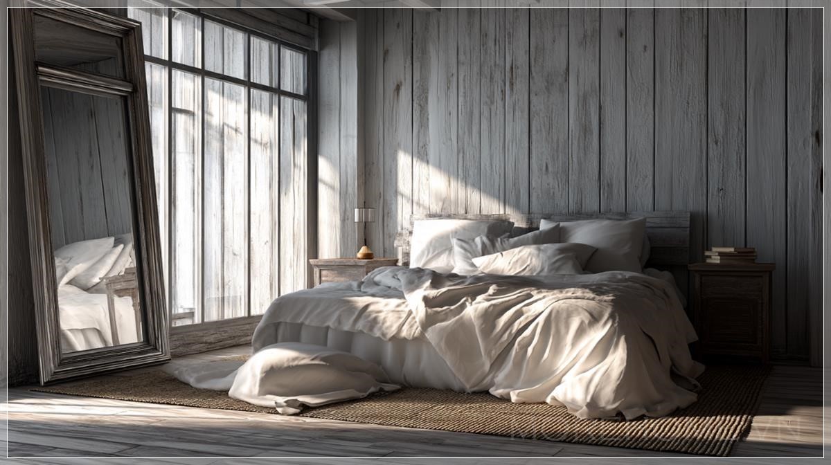 Qua lớp gương bạc đã ngả màu theo thời gian, chiếc giường đôi êm ái hiện lên với đường nét mềm mại, không rõ ràng như trong thực tế mà trở nên mơ màng, gần như trừu tượng. Hai chiếc tủ đầu giường đồng bộ đứng canh giữ hai bên, như những người bạn thầm lặng chứng kiến giấc ngủ và những giấc mơ của chủ nhân.