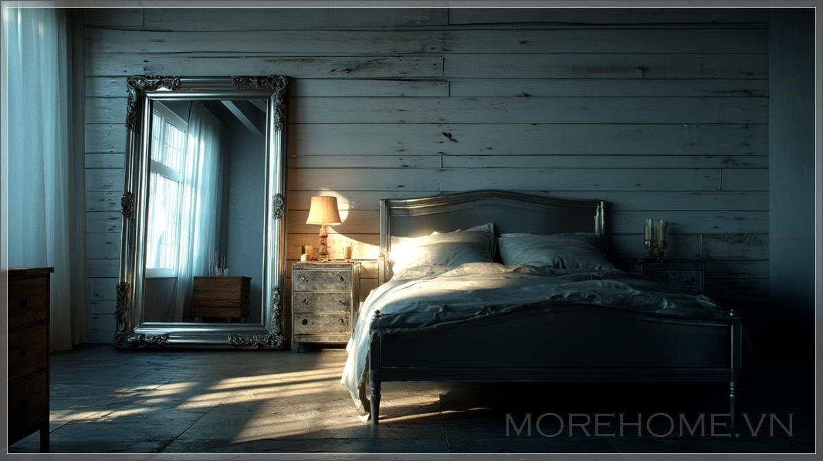 Khi ánh sáng len lỏi qua kẽ hở của rèm cửa, nó tạo nên những dải vàng mềm mại trên bề mặt gương bạc cổ. Nơi đây, mọi thứ đều trở nên mơ hồ, như thể thời gian đã ngừng trôi, và chúng ta được phép nhìn ngắm một khoảnh khắc riêng tư của không gian sống.