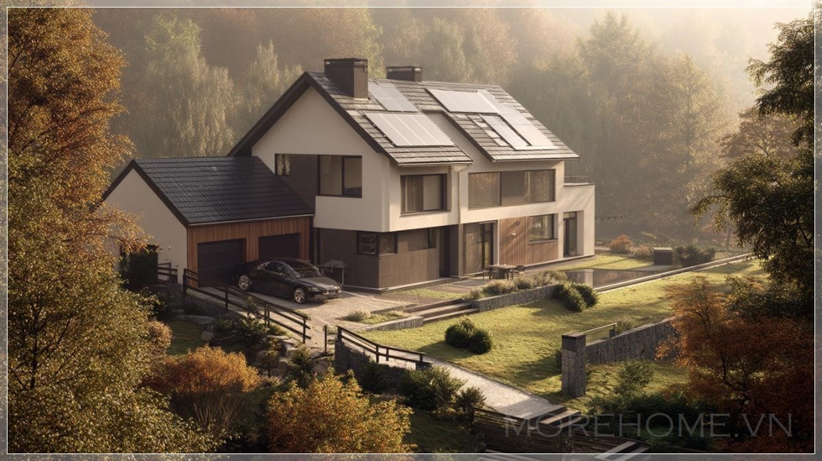 Nằm giữa khung cảnh thiên nhiên tươi đẹp, ngôi nhà gia đình này như một bức tranh hoàn hảo của cuộc sống hiện đại mà vẫn gần gũi với thiên nhiên. Ánh nắng chiều dần buông xuống, phản chiếu trên những tấm pin năng lượng mặt trời đặt trên mái nhà, tạo nên một vẻ đẹp vừa tinh tế vừa đầy tính công nghệ.