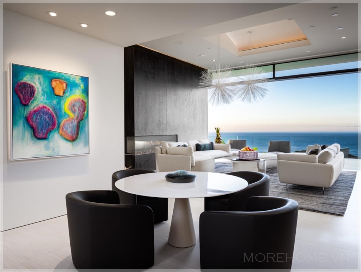 Không gian mở rộng rãi được định nghĩa bởi những đường nét sạch sẽ và bảng màu trung tính, tạo nên canvas hoàn hảo cho những điểm nhấn màu sắc táo bạo. Một bức tranh trừu tượng với những gam màu coban và cam rực rỡ trở thành tâm điểm của phòng khách, trong khi chiếc ghế bành nhung màu ngọc lục bảo tạo nên góc đọc sách quyến rũ bên cửa sổ. Mỗi món đồ nội thất được lựa chọn không chỉ vì tính thẩm mỹ mà còn vì chức năng, từ chiếc bàn cà phê bằng đá cẩm thạch Carrara đến những chiếc đèn pendant hiện đại treo trên đảo bếp.