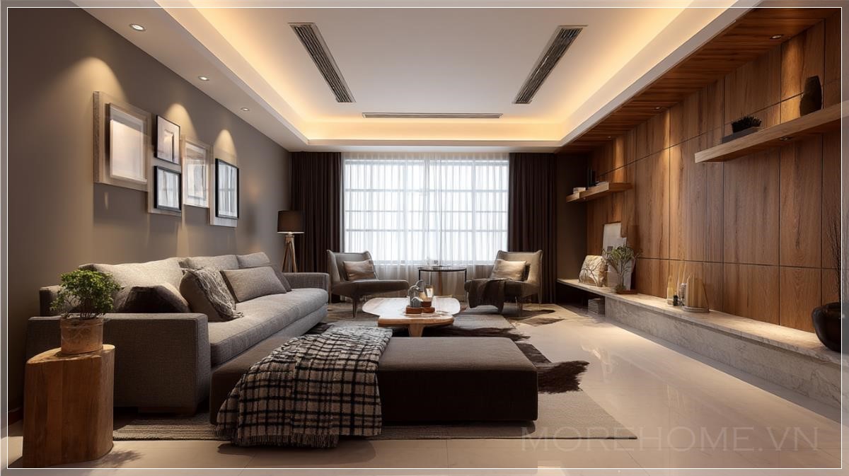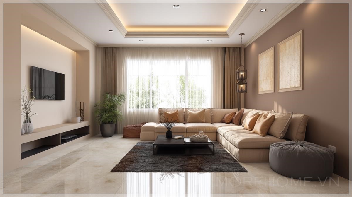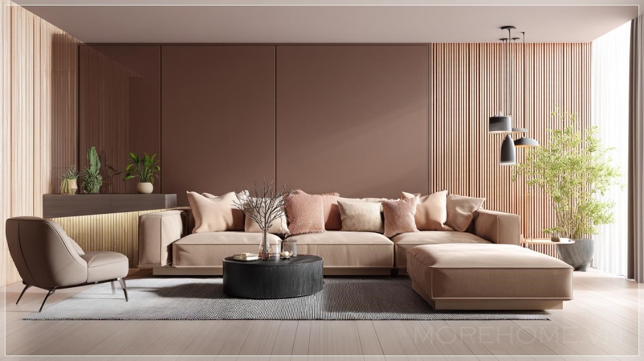 Khi bước vào một phòng khách được thiết kế theo phong cách này, điều đầu tiên bạn cảm nhận được chính là sự ôm ấp từ những bức tường màu nâu nhạt, như ánh nắng chiều thu đang dịu dàng vuốt ve không gian. Không cần những họa tiết rườm rà hay trang trí phức tạp, vẻ đẹp ở đây nằm ở sự giản dị đến hoàn hảo. Mỗi đường nét, mỗi góc cạnh đều được tính toán kỹ lưỡng để tạo nên một bức tranh hài hòa, nơi mắt có thể nghỉ ngơi và tâm hồn tìm thấy sự tĩnh lặng.
