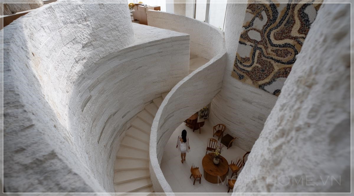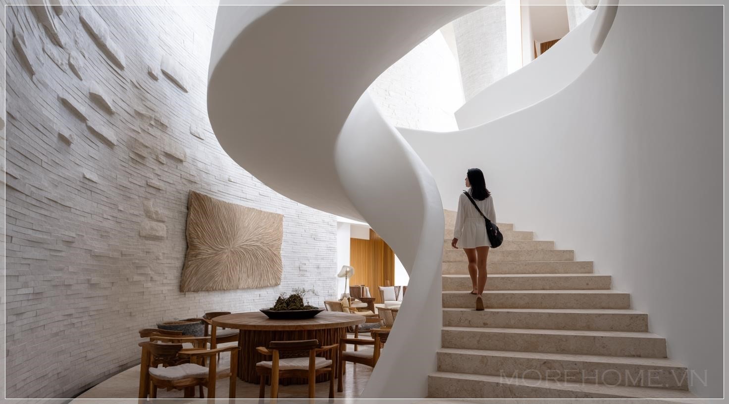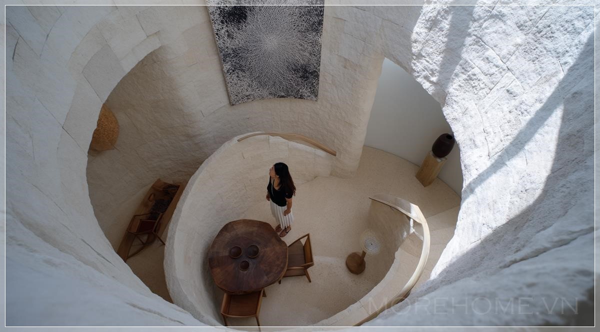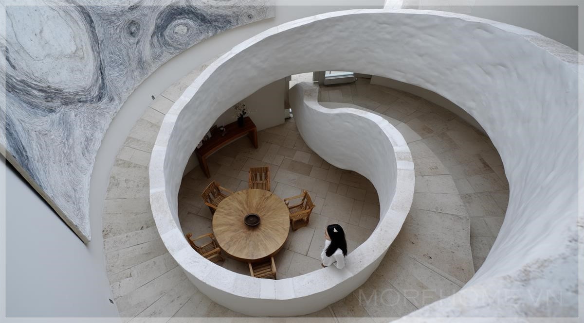 Bước vào không gian này, điều đầu tiên bạn cảm nhận được chính là sự tĩnh lặng đến kỳ lạ. Trần nhà cao gấp đôi tạo ra một cảm giác vô tận, như thể bạn đang đứng trong lòng một chiếc vỏ ốc khổng lồ được mở ra. Những bức tường cong mềm mại, được hoàn thiện bằng thạch cao trắng tinh khôi, phản chiếu ánh sáng một cách nhẹ nhàng, tạo nên một bầu không khí gần như thiêng liêng.