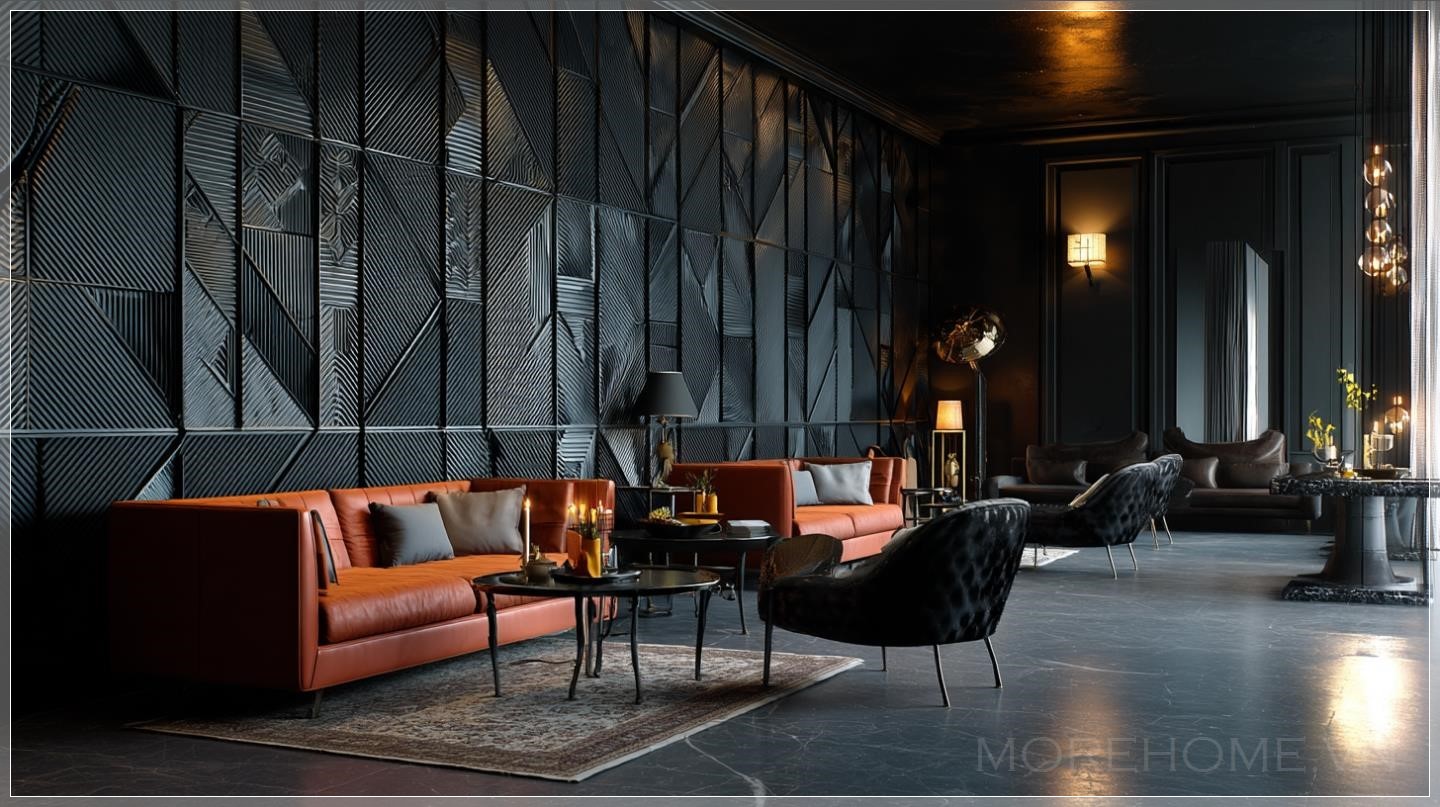 Bức tường đen bóng loáng trở thành điểm nhấn chính của không gian, không phải là sự u ám mà ngược lại, nó mang đến một cảm giác sâu lắng và bí ẩn. Trong triết lý thiết kế của Christian Liaigre, màu đen không bao giờ là sự đơn điệu hay trống rỗng. Thay vào đó, nó là nền tảng để các yếu tố khác tỏa sáng - từ ánh sáng nhẹ nhàng của những chiếc đèn được đặt chiến lược, đến texture mềm mại của da thuộc cao cấp trên những chiếc ghế bành sang trọng.