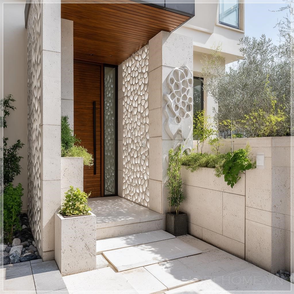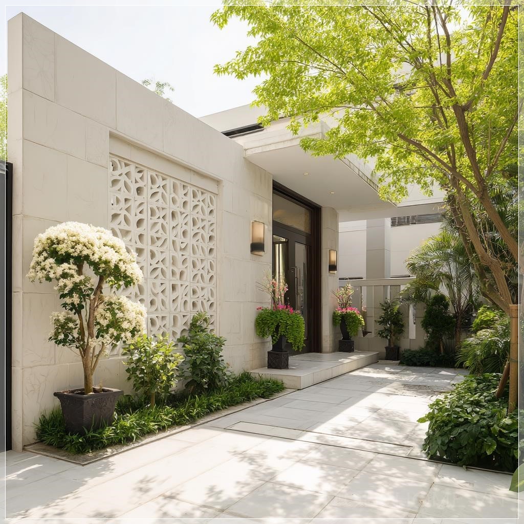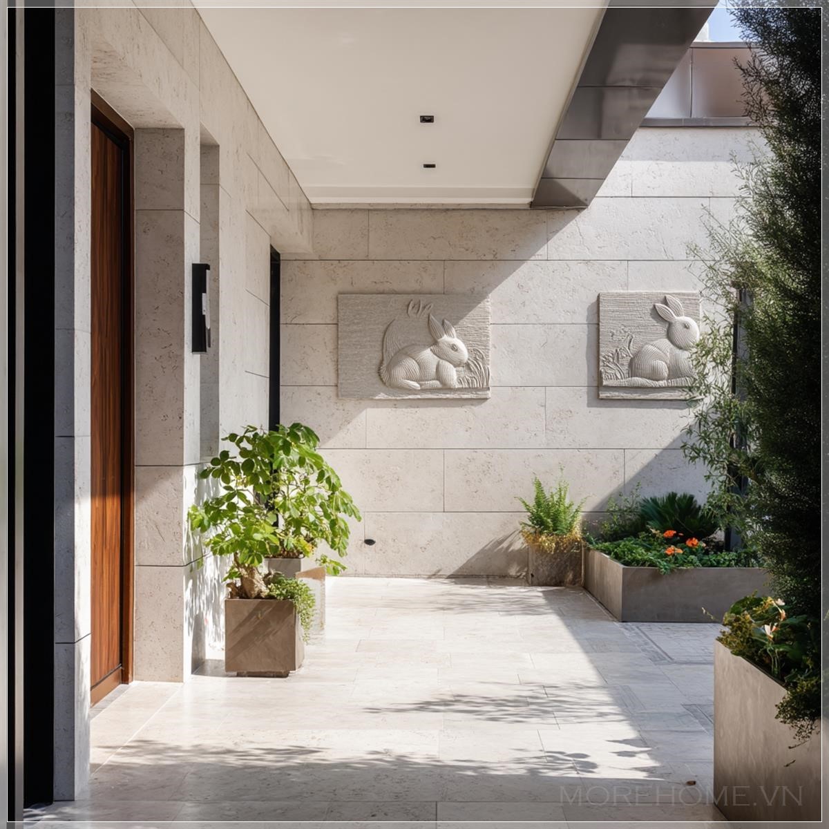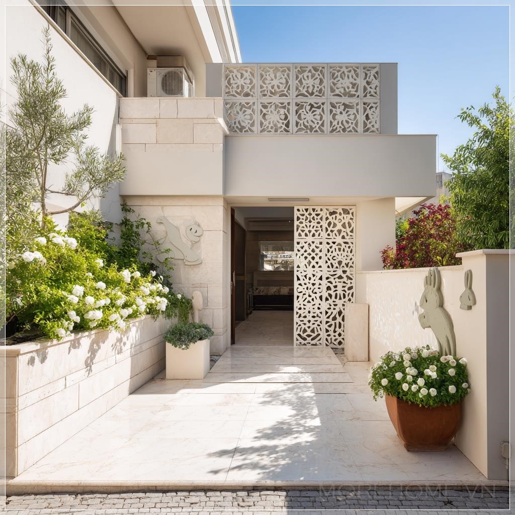 Bước qua ngưỡng cửa là bước vào một thế giới hoàn toàn khác biệt. Nơi đây, ánh sáng tự nhiên nhẹ nhàng tràn ngập không gian, tạo nên những vệt sáng lung linh trên từng viên đá trắng tinh khiết. Đây không chỉ đơn thuần là một sân vườn, mà là tác phẩm nghệ thuật sống động, nơi mỗi chi tiết đều được chăm chút tỉ mỉ để tạo nên sự hài hòa hoàn hảo giữa kiến trúc hiện đại và thiên nhiên.