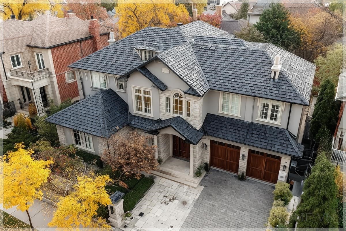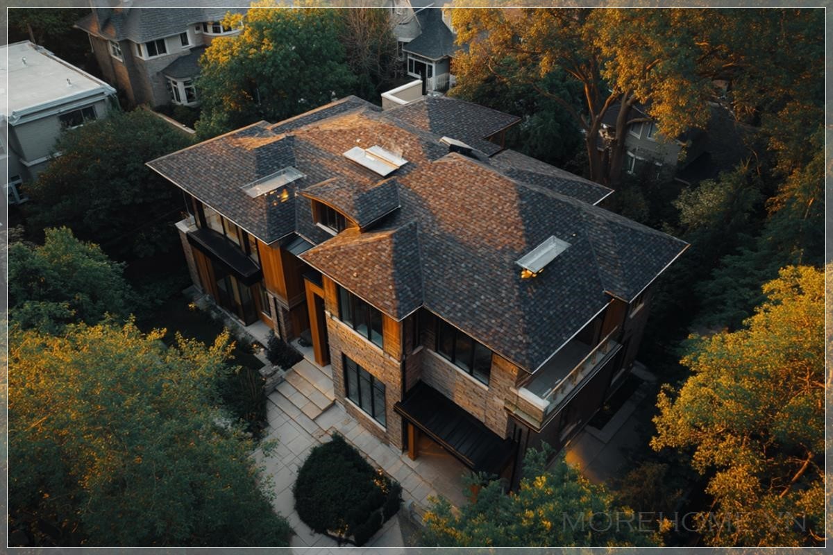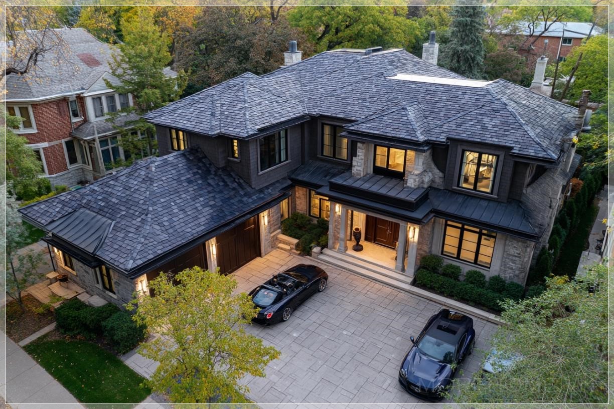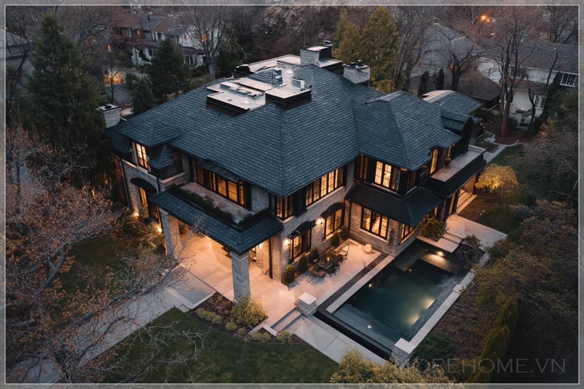 Mái ngói truyền thống tạo nên đường nét mềm mại, tương phản tuyệt đẹp với những chi tiết kiến trúc sắc cạnh của phong cách hậu hiện đại. Từ góc nhìn trên cao, ta có thể chiêm ngưỡng trọn vẹn sự hài hòa giữa vật liệu cổ điển và thiết kế đương đại - một minh chứng cho tài năng của các kiến trúc sư Toronto trong việc kết hợp tinh tế giữa truyền thống và hiện đại.