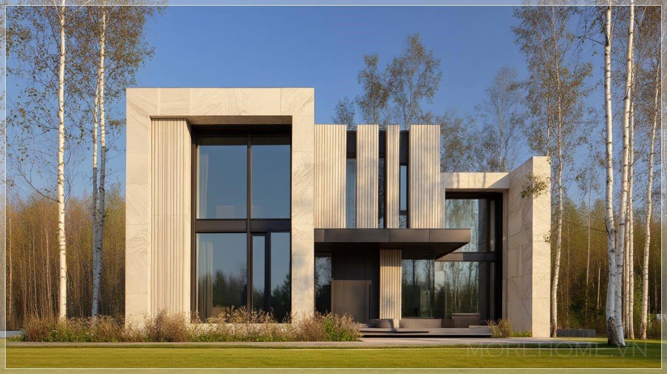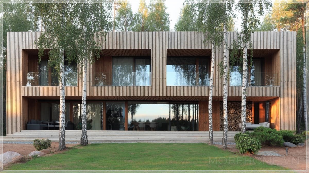 Những tia nắng vàng óng của giờ hoàng hôn len lỏi qua tán lá bạch dương, tạo nên một khung cảnh thơ mộng khó có thể quên được. Chính giữa khoảng không gian xanh mát ấy, một ngôi nhà hai tầng hiện đại bỗng hiện ra như một tác phẩm nghệ thuật được chạm khắc tỉ mỉ, nơi mà ranh giới giữa kiến trúc và tự nhiên dường như được xóa nhòa một cách hoàn hảo.