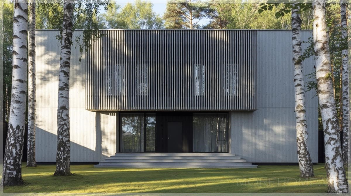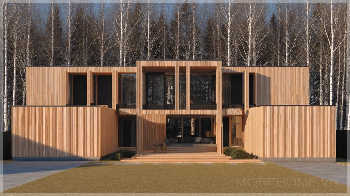 Mặt tiền của ngôi nhà được ốp gỗ sáng màu tạo nên sự ấm áp đặc trưng, như một lời chào mời nhẹ nhàng đến với những ai muốn tìm kiếm sự yên bình giữa cuộc sống hiện đại. Những thanh gỗ được sắp xếp theo chiều dọc tạo nên nhịp điệu riêng biệt, vừa hiện đại vừa gần gũi với thiên nhiên xung quanh. Màu sắc của gỗ hòa quyện tuyệt vời với sắc xanh của những tán lá bạch dương, tạo nên một bản giao hưởng màu sắc đầy hài hòa.