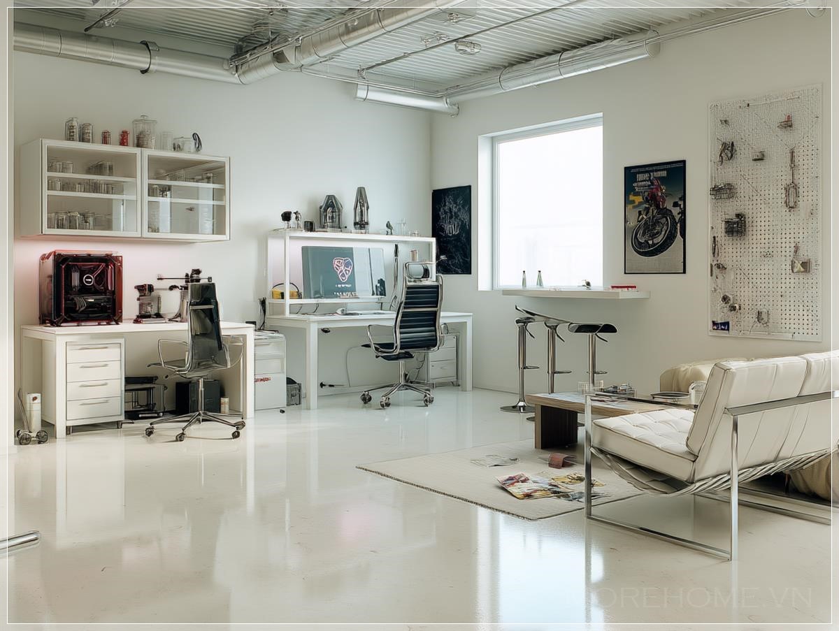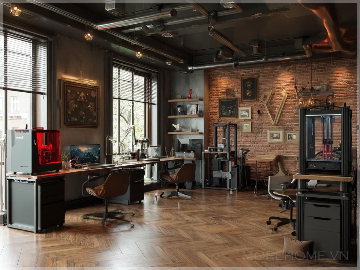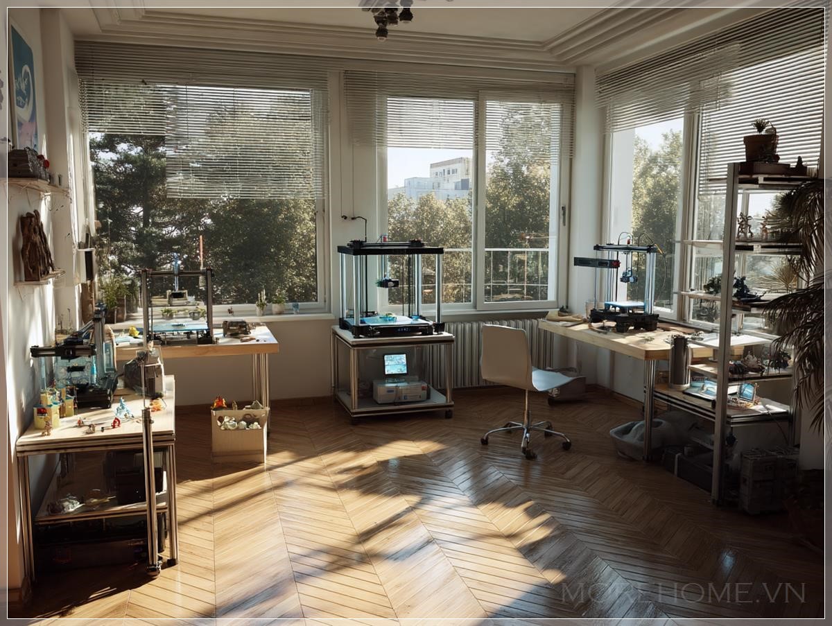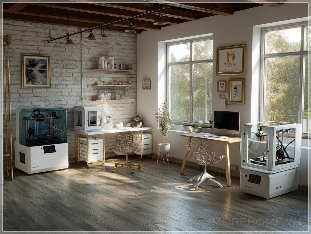 Bước vào căn phòng này giống như du hành đến tương lai - nơi âm thanh nhẹ nhàng của các máy in 3D hòa quyện tạo nên bản giao hưởng công nghệ đầy mê hoặc. Ánh sáng LED trắng xanh chiếu rọi từ trần nhà, tạo ra một không gian làm việc hoàn hảo với độ chính xác đến từng chi tiết nhỏ nhất.