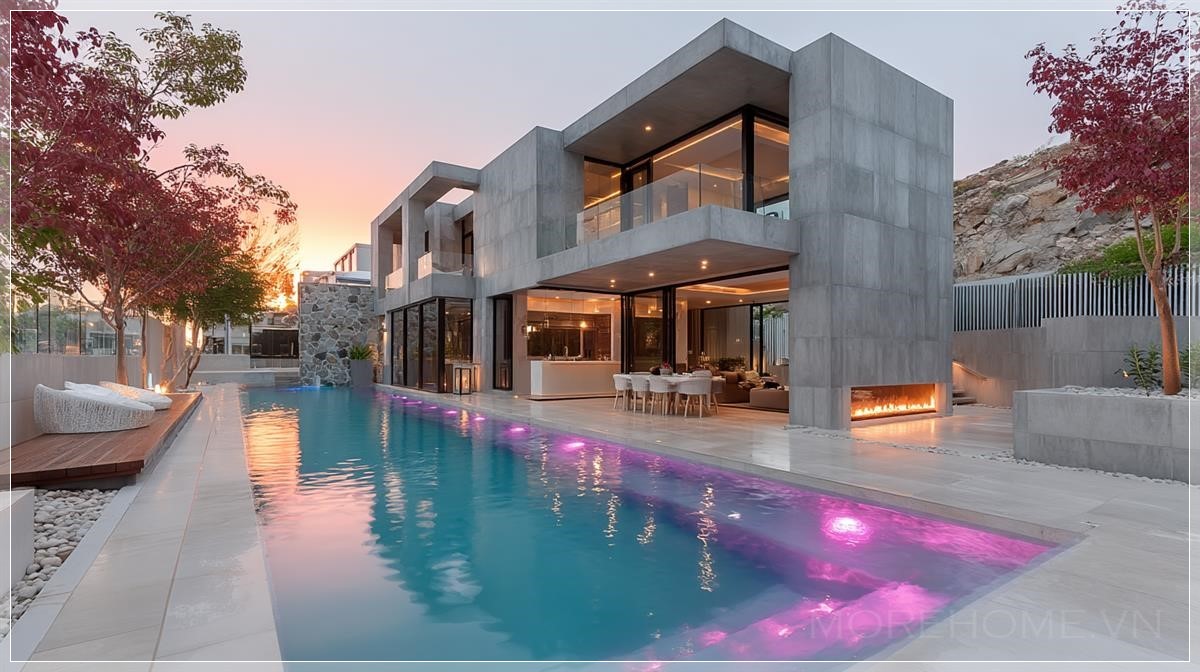 Kiến trúc tối giản không có nghĩa là thiếu hụt cảm xúc. Ngược lại, chính sự tinh giản trong thiết kế đã tạo điều kiện cho ánh sáng tự nhiên trở thành yếu tố trang trí chủ đạo. Khi hoàng hôn buông xuống, các tông màu ấm áp từ cam nhạt đến đỏ đậm dần dần bao phủ không gian, biến căn biệt thự thành một bức tranh sống động với màu sắc luôn thay đổi theo từng phút từng giây.