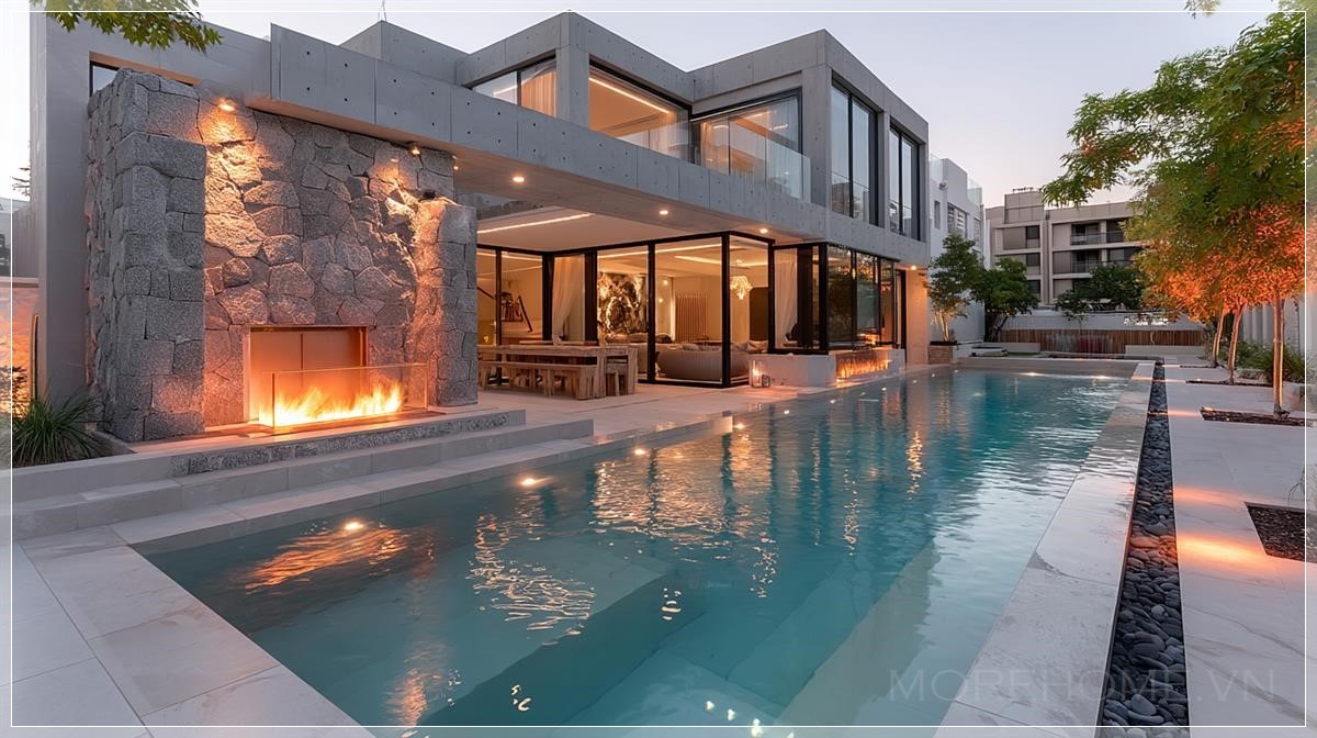 Không gian mở với thiết kế liền mạch từ phòng khách đến khu vực hồ bơi tạo nên cảm giác tự do và rộng rãi. Chính sự liên kết này đã biến ngôi nhà không chỉ là nơi trú ẩn mà còn là không gian sống thực thụ, nơi mà mỗi khoảnh khắc trong ngày đều mang đến những trải nghiệm khác nhau về ánh sáng, màu sắc và không khí.